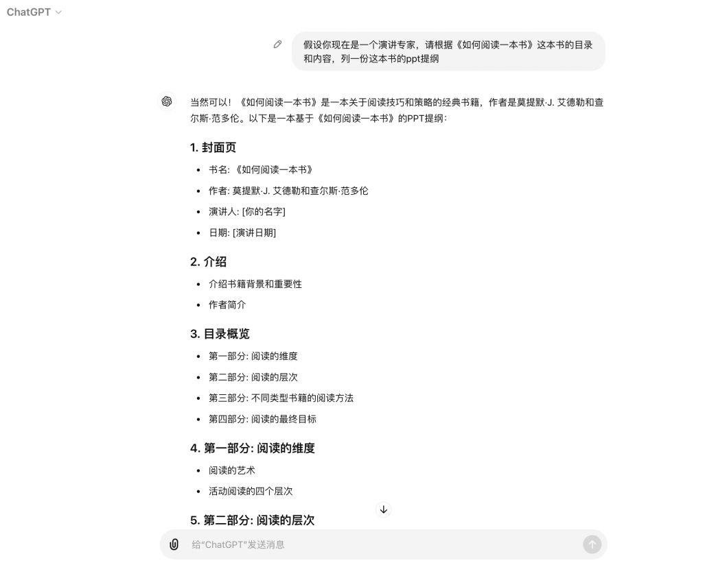1,选择一个主题,例如生成《高效人士的七个习惯》这本书的演讲和分析ppt。在对广义知识的学习上,ChatGPT比较强,所以先调用ChatGPT的接口,生成这个ppt的提纲。