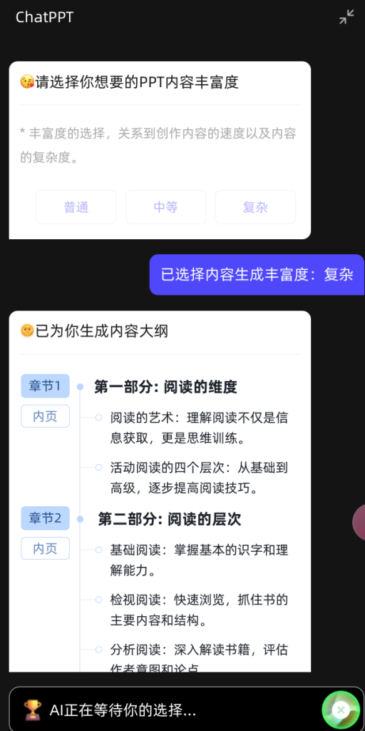 2,将ppt提纲通过接口导入到ChatPPT,选择复杂的呈现方式,生成漂亮的PPT
